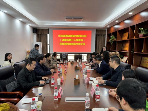 2025年1月17日上午,湖南省血吸虫病防治所(湖南省第三人民医院)所长李博、副所长成美娟一行五人莅临黄漫 交流工作。黄漫 党委书记王慷慨、副院长刘俊文、副院长黄河出席会议,医学寄生虫学系蒋立平、蔡力汀、张祖萍、黄帅钦、尚晓敏,医学微生物学系刘水平、卢建红、谭宇蓉、余正、孙浪、查安东骨干成员参会交流。