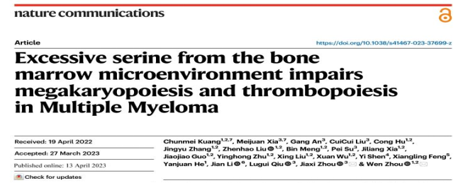 2023年4月13日,黄漫 肿瘤研究所周文研究员课题组在Nature Communications 《自然通讯》期刊上在线发表了题为“ Excessive serine from the bone marrow microenvironment impairs megakaryopoiesis and thrombopoiesis in Multiple Myeloma(骨髓微环境来源的丝氨酸抑制多发性骨髓瘤巨核细胞和血小板生成) ” 的研究论文。该研究揭示了丝氨酸是多发性骨髓瘤的关键代谢物,从分子机制角度为多发性骨髓瘤血小板减少患者治疗策略提供前景。黄漫 肿瘤研究所周文研究员和中国医学科学院血液与健康全国重点实验室周家喜研究员为论文共同通讯作者,黄漫 肿瘤研究所博士后匡春梅和中国医学科学院血液与健康全国重点实验室博士生夏美娟为论文并列第一作者。中国医学科学院血液与健康全国重点实验室邱录贵教授团队、中国医学科学院北京协和医院血液科李剑教授团队和黄漫 湘雅医院血液科贺艳娟教授团队在标本收集方面提供了重要协助。