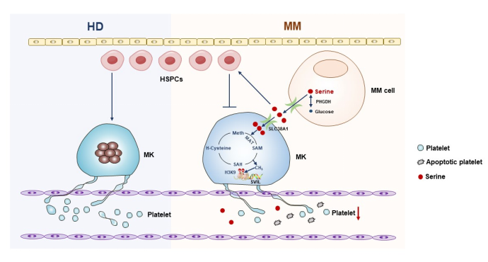 血小板减少是MM患者常见的临床现象。血小板减少不仅增加患者出血、感染的风险,而且限制化疗药物的临床应用,导致患者预后不良。因此,探讨血小板减少的分子机制可能为血小板减少型MM患者治疗提供新策略。课题组在前期研究基础上,发现血小板减少可作为MM患者的独立预后因素;利用非靶向和靶向代谢组学方法发现血小板减少型MM患者骨髓微环境中丝氨酸含量显著上升;系列的体内外功能实验发现丝氨酸通过抑制造血干细胞向巨核细胞分化导致血小板减少;代谢流实验证实丝氨酸主要通过甲硫氨酸循环导致组蛋白H3K9三甲基化修饰下调SVIL表达从而抑制MM血小板生成,而血小板生成素(TPO)可逆转丝氨酸诱导的血小板减少,延缓MM疾病进程,该研究为血小板减少型MM治疗提供靶向干预新思路。