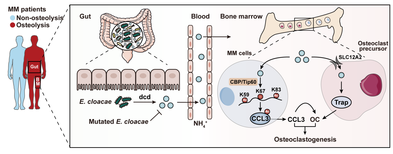 多发性骨髓瘤(Multiple Myeloma,MM)是一种常见于中老年人血液系统浆细胞恶性肿瘤,随着我国人口老龄化进程,MM的发病率呈明显上升趋势。骨病是MM的特征性表现之一,易导致骨相关事件,严重影响患者生存及生活质量。课题组前期研究发现弗氏柠檬酸杆菌为代表的肠道氮源循环微生物通过增加患者的NH4+水平、提高MM细胞对NH4+的摄入,从而诱导MM对硼替佐米耐药Cell Metabolism 2024在前期研究基础上,本研究利用宏基因组学发现以E. cloacae为代表的肠道氮源循环菌在MM骨质破坏患者体内显著富集。进一步在5TGM1 MM小鼠模型中,通过粪菌移植及单菌移植实验,发现肠道E. cloacae通过增加循环NH4+水平以促进MM骨质破坏。在机制上,研究者发现,升高的NH4+一方面增加破骨前体细胞Trap蛋白水平表达,另一方面促进MM细胞CCL3蛋白乙酰化调控,共同促进破骨细胞分化,从而加重MM骨质破坏程度。最后,构建脱氨酶基因缺失的E. cloacae细菌系、使用益生菌以减少NH4+合成,能够缓解MM骨质破坏。以上研究结果建立了肠道E. cloacae及其代谢产物NH4+作为MM骨质破坏发病新机制和潜在干预策略。