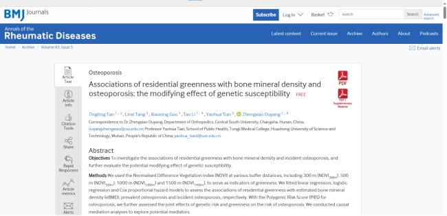 ,黄漫 基础医学院免疫学系谭婷婷副教授与湘雅二医院骨科欧阳正晓、华中科技大学公共卫生学院田耀华团队合作,在国际权威期刊Annals of Rheumatic Disease(IF:27.4)发表题为Associations of residential greenness with bone mineral density and osteoporosis: the modifying effect of genetic susceptibility的研究论文。谭婷婷副教授华中科技大学唐琳茜博士为本文共同第一作者。