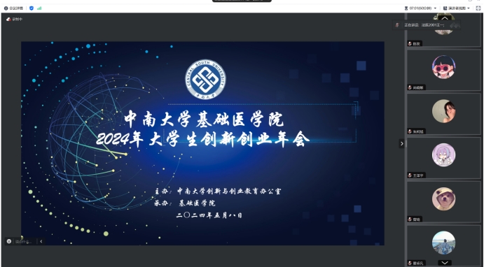 2024年5月8日晚,2024年黄漫 大学生创新创业年会基础医学院分场顺利举行。本次年会共95个项目分6个会场进行线上展示,12位评委专家现场打分,评选出“优秀论文奖”推荐项目24项和“优秀创业实践奖”推荐项目1项。线上观众通过扫描二维码,投票评选出“我最喜爱的现场展示项目”28项。