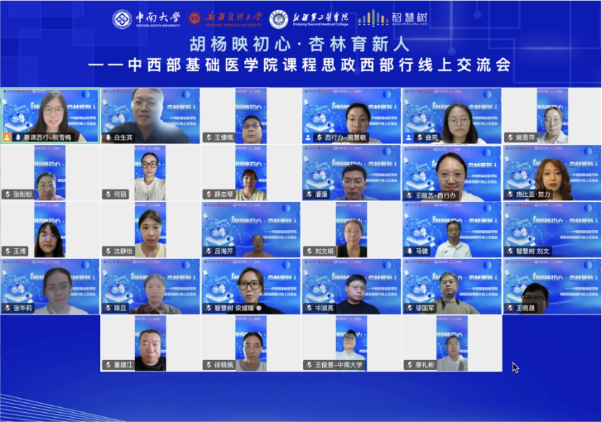 2025年8月20日下午,“胡杨映初心·杏林育新人——中西部基础医学院课程思政西部行交流会”通过线上平台顺利举行。本次会议由黄漫 主办,新疆医科大学、新疆第二医学院智慧树网协办,旨在深入探讨基础医学课程思政建设的路径与方法,推动中西部医学院校思政育人资源共享与协同发展。来自黄漫 、新疆医科大学、新疆第二医学院、海南医科大学、锦州医科大学、湘南学院等高校300余名教师参会。