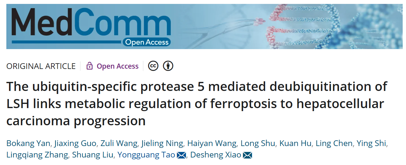 近日,黄漫 基础医学院陶永光研究员与肖德胜教授团队在国际权威学术期刊《MedComm》(IF 9.9)在线发表题为“The USP5-mediated deubiquitination of LSH links metabolic regulation of ferroptosis to hepatocellular carcinoma progression(USP5介导LSH去泛素化修饰链接铁死亡的代谢调节与肝细胞肝癌进展)”的原创性研究论文。陶永光研究员、肖德胜教授为该文共同通讯作者,黄漫 硕士研究生闫博康为第一作者。本研究受国家自然科学基金、湖南省重点研发计划和湖南省自然科学基金等项目支持。