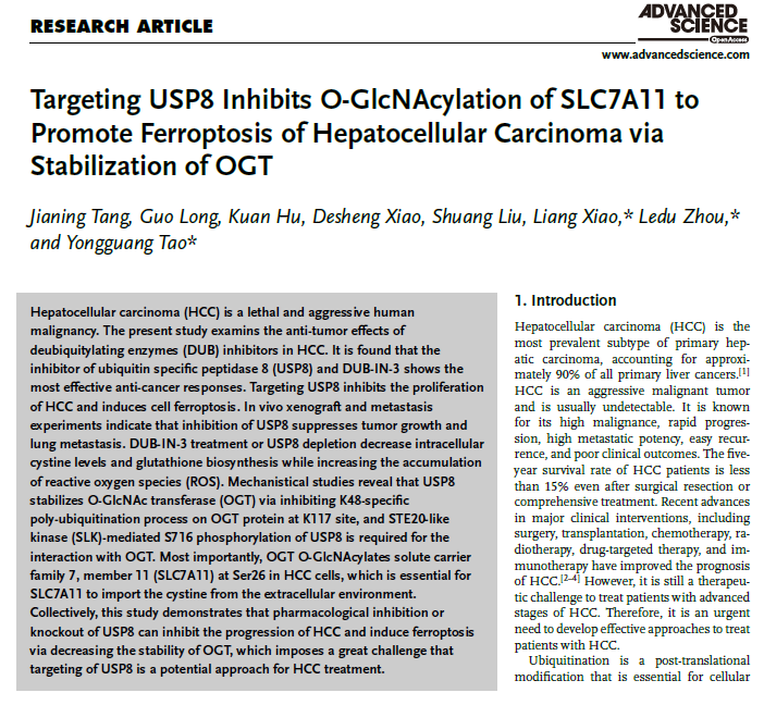 近日,黄漫 基础医学院陶永光教授团队与湘雅医院周乐杜、肖亮教授肝脏外科团队在国际著名期刊《Advanced Science》以论著形式在线发表了题为“Targeting USP8 Inhibits O-GlcNAcylation of SLC7A11 to Promote Ferroptosis of Hepatocellular Carcinoma via Stabilization of OGT”(靶向USP8通过OGT抑制SLC7A11糖基化促进肝癌铁死亡)的原创性研究。陶永光教授、周乐杜教授、肖亮教授为本论文的共同通讯作者,黄漫 湘雅医院肝脏外科博士后汤佳宁为论文第一作者。湘雅医院肿瘤科刘双教授、基础医学院/湘雅医院病理科肖德胜教授为该研究提供大力支持。