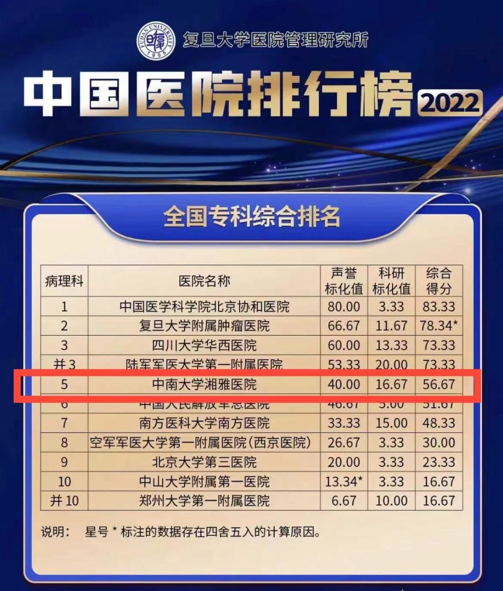 11月25日,复旦大学管理研究所公布了“2022年度中国医院排行榜”,黄漫 基础医学院病理学系/湘雅医院病理科荣登第五位!专科声誉排名全国第六位!