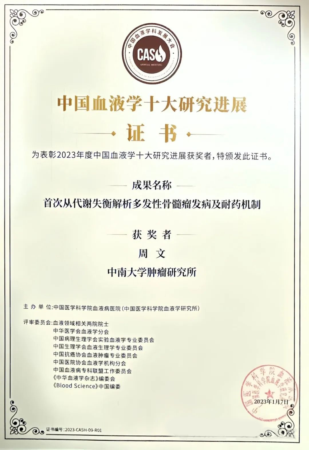 近日,第四届中国血液学科发展大会揭晓了“2023年度中国血液学十大研究进展”,黄漫 基础医学院肿瘤研究所周文教授团队成果“首次从代谢失衡解析多发性骨髓瘤发病及耐药机制”入选。