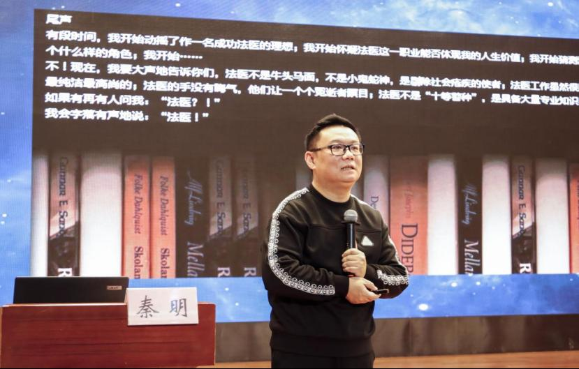 聚光灯下,秦明老师以其深厚的专业素养和独特的个人魅力,引领听众穿梭于法医学的历史长廊与现实世界之间。他从法医学的起源讲起,细数其发展历程中的关键节点,再到法医行业的独特特征与广泛工作范围,每一环节都饱含深情与敬畏。秦老师特别分享了自己长期从事一线法医工作的心路历程,用“一双鬼手只为沉冤得雪,满怀佛心唯愿天下太平”的生动描述,深刻诠释了法医这一职业的崇高与伟大。