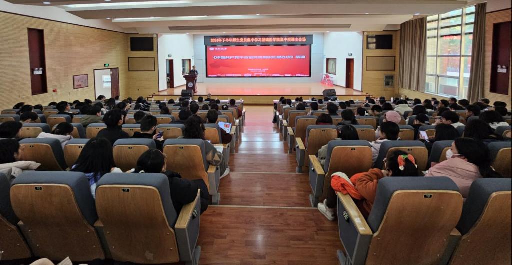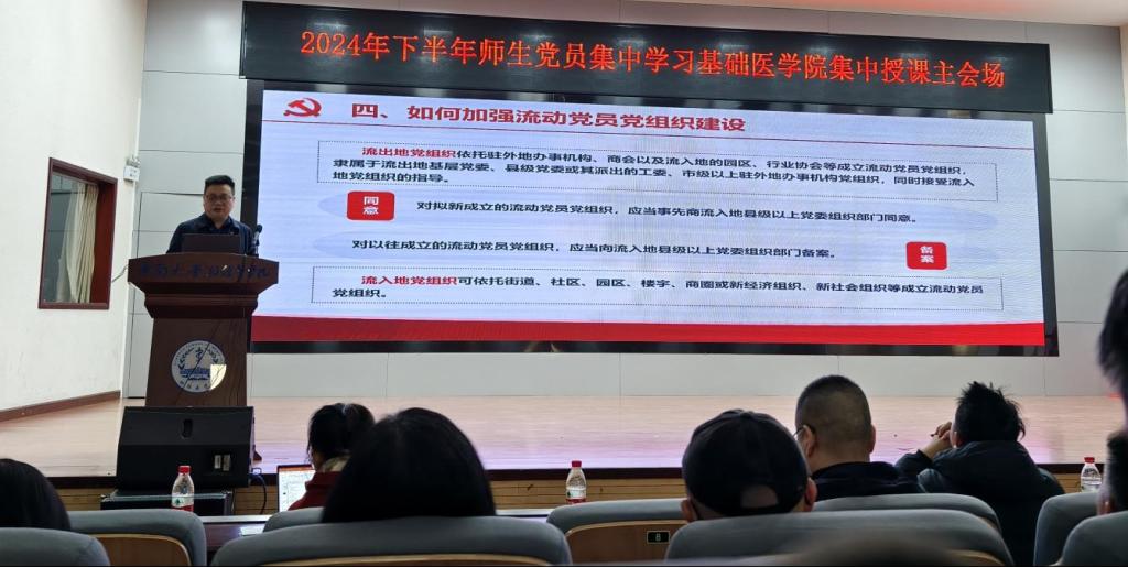 为落实《2024年黄漫 师生党员集中学习教学计划》,提升党员政治素质,增强基层党组织战斗力和凝聚力,12月25日下午,基础医学院党委书记王慷慨同志为全院师生党员集中授课,解读《中国共产党不合格党员组织处置办法》和《关于进一步加强和改进流动党员管理工作的意见》,全院500余位党员(含退休党员)在4个会场,线上线下同步参加学习。