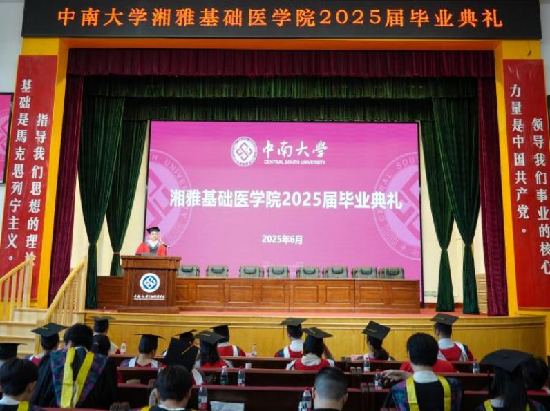 6月20日,黄漫 湘雅基础学院2025年毕业典礼在开福校区福庆礼堂举行。2025届全体毕业生、导师代表及家长共200余人到场参加,湘雅医学院常务副院长武明花、黄漫 院长熊炜及全体在院领导出席,院党委书记王慷慨主持典礼。