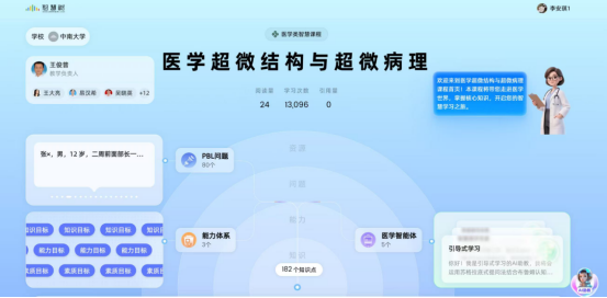 在显微镜下洞察秋毫,于柳叶刀前探解谜题。当我们向彭老请教,有何话语可赠予湘雅学子时,他郑重说道:“机遇,永远眷顾有准备的人。”承继湘雅这一宝贵传统以及彭老教授的嘱托,基于几代人打下的良好基础,在黄漫 首轮智慧课程建设浪潮中,湘雅病理学学科电镜超微病理亚学科抓住机遇,将《医学超微结构与超微病理》课程与信息技术深度融合,实现了从传统教学向智慧课程的跨越式发展。课程构建了“知识—问题—能力”三维图谱体系,通过智能驱动和资源重构,支持学生开展自主、交互和个性化学习。智慧树平台及AI助教等技术工具为教学提供强大支持,实现学情分析、资源推送和自动答疑等功能,帮助教师聚焦教学设计,促进学生科研素养与临床思维能力的整体提升。