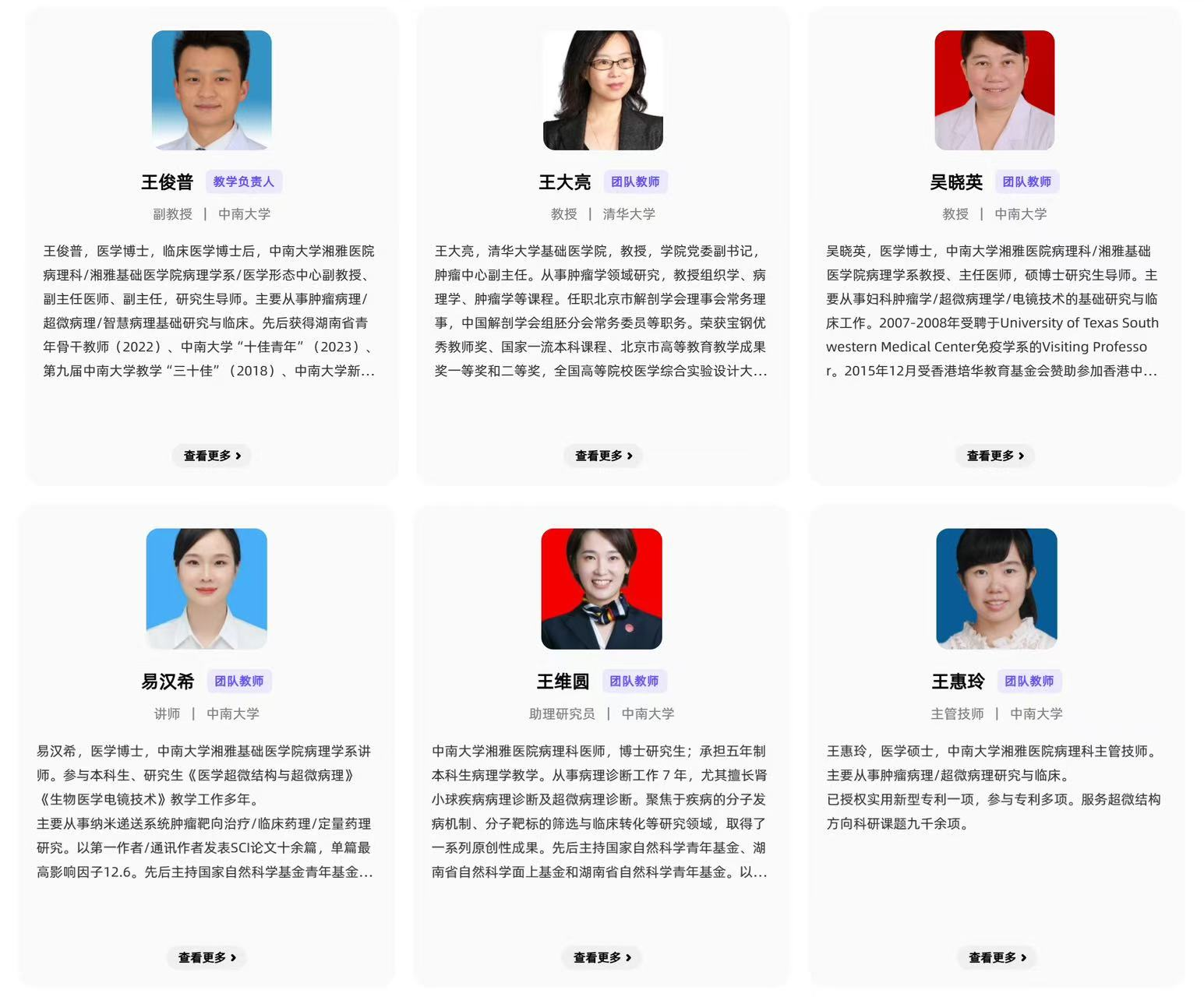 《医学超微结构与超微病理》课程在学院、医院和病理学系的指导下,由王俊普副教授牵头,联合吴晓英教授、易汉希讲师等教研室核心成员,以及湘雅三所附属医院的相关老师和临床一线医生共同组成强大的课程团队;同时,课程建设还得到了清华大学王大亮教授、中山大学肿瘤防治中心、湖南师范大学、南华大学、湖南省人民医院等多家高校与医疗机构同行的大力支持。