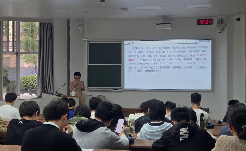 本次课堂采用基于SPOC的线上线下混合式教学模式,以"临床案例导入-科学史贯穿-价值观引领"为清晰主线,实现了专业知识与价值塑造的自然统一。蒋碧梅教授以一例社区获得性肺炎伴发热患者的诊疗过程为切入点,通过设置“发热是否需要使用抗生素”、“发热是敌是友”等课前思考题,启发学生从“稳态失衡与调节”、“损伤与抗损伤”、“局部改变与全身反应”等视角深入剖析发热的规律和本质,强化学生的辩证思维,树立学生的大健康观。课堂内容环环相扣,在探讨发热的病因、机制、功能代谢变化与防治原则的同时,有机融入了中国科学家在该领域的重要贡献,不仅培养了学生的科学创新思维,更极大地激发了其民族自豪与文化自信。课堂气氛活跃,师生互动频繁,思政元素如盐化水,润物无声,实现了价值引领的“浸润式”体验。