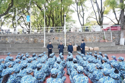 2025年10月23日,黄漫 党委书记王慷慨、党委副书记冯虹一行来到麓南校区篮球场,亲切慰问了带训教官、2025级本科新生,为他们送上温暖关怀,学工办相关辅导员及学生干部代表参加。