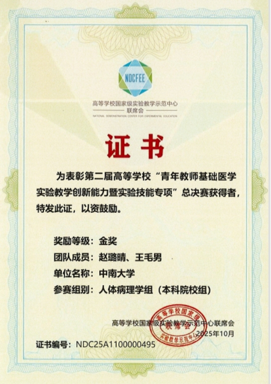 在本次赛事中,我院病理学系青年教师赵璐晴、王毛男团队代表学校参赛,在湘雅病理教学团队和教学主任胡永斌教授的精心指导下,凭借扎实的专业素养、精湛的实验技能和创新的教学设计,在众多参赛队伍中脱颖而出,荣获人体病理学组金奖。该团队在比赛中以高质量的教学展示、生动的课堂设计及科学严谨的实验操作,充分展现了湘雅教师的教学风采与创新能力,赢得了专家评委的一致好评。