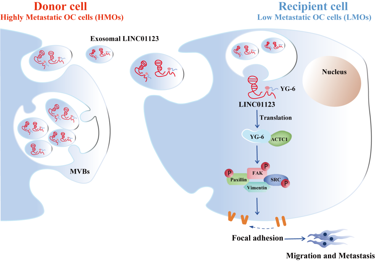 近日,黄漫 湘雅基础医学院病理学系/湘雅医院病理科殷刚教授团队在国际权威学术期刊Molecular Cancer(JCR 1区, IF=33.9)在线发表了题为“Micropeptide YG-6 Encoded by Exosomal LINC01123 Derived from Highly Migratory Ovarian Cancer Cells Promotes Tumor Progression”的研究论文。基于肿瘤内异质性理论,本研究发现高转移性卵巢癌细胞(HMOs)可通过分泌外泌体LINC01123促进低转移性卵巢癌细胞(LMOs)的迁移和粘附,提示外泌体可影响肿瘤内表型异质性。有趣的是,LINC01123编码一个由59aa组成的小肽,命名为YG-6(LINC01123 Yield peptide Gaining metastasis function: ORF no.6),在卵巢癌细胞和组织中均表现出内源性高表达。功能实验表明,LINC01123通过编码微肽YG-6促进肿瘤进展,而不是通过RNA依赖机制。此外,研究还发现YG-6肽与ACTC1结合激活局灶粘附信号通路,从而促进LMOs的迁移和粘附。综上所述,该研究结果不仅证明了由LINC01123编码的YG-6肽是卵巢癌的潜在预后生物标志物,而且揭示了YG-6肽驱动卵巢癌进展的新机制。该研究相关技术成果已获国家发明专利授权。