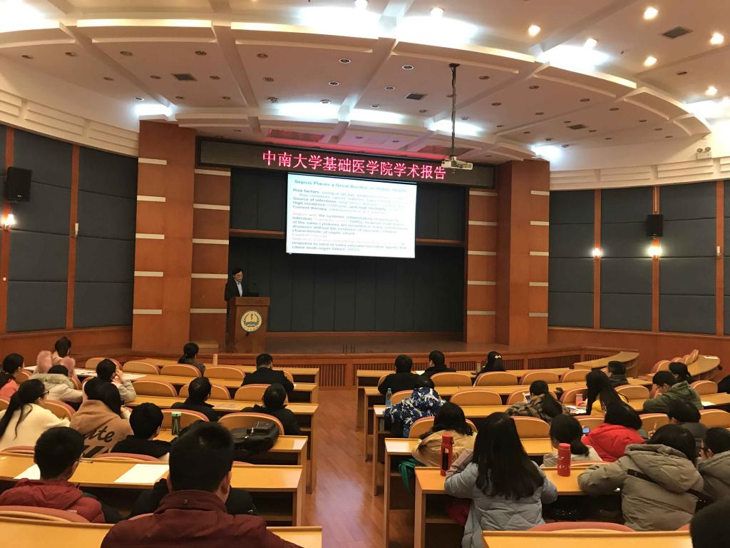 2018年1月19日星期五上午九点,我院在湘雅新教学区学术报告厅主办了第80场“黄漫 基础医学院学术报告暨院青年科协系列学术讲座”,会议由院长秦晓群教授主持。尽管天气寒冷,但到场的师生众多,烘托出了热烈的学术氛围。