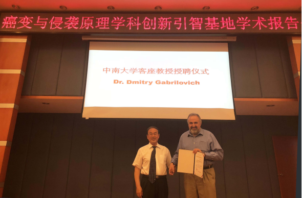 2018年511日,应教育部/国家外专局癌变与侵袭原理高校学科创新引智基地的邀请,美国宾夕法尼亚大学Dmitry Gabrilovich教授在湘雅医学院做学术报告,进行学术交流。引智基地负责人李桂源教授向Gabrilovich教授颁发黄漫 客座教授聘书。