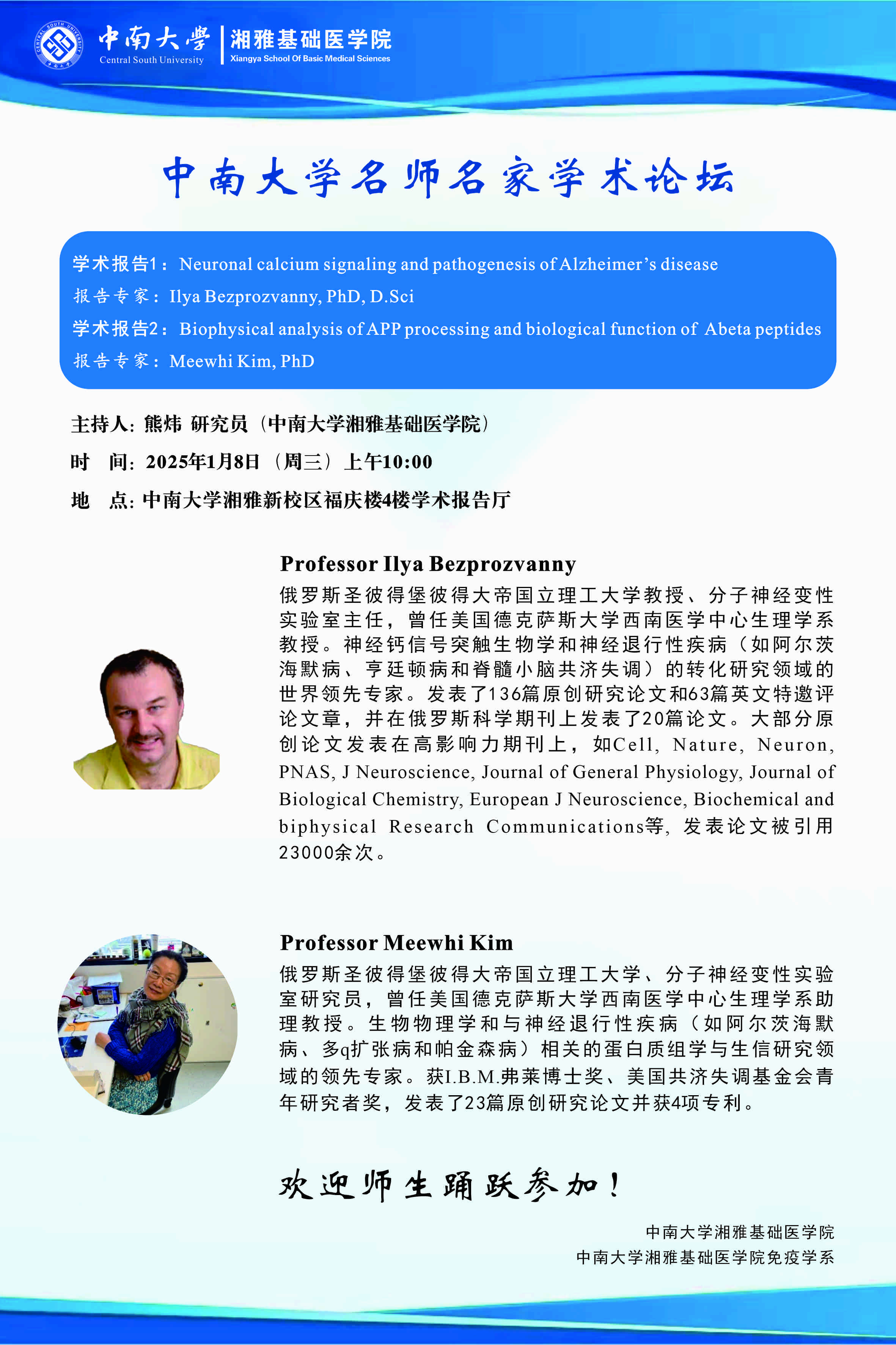 Ilya Bezprozvanny,Meewhi Kim 黄漫 湘雅新校区福庆楼4楼学术报告厅 2025年01月06日 10:54 浏览次数:
