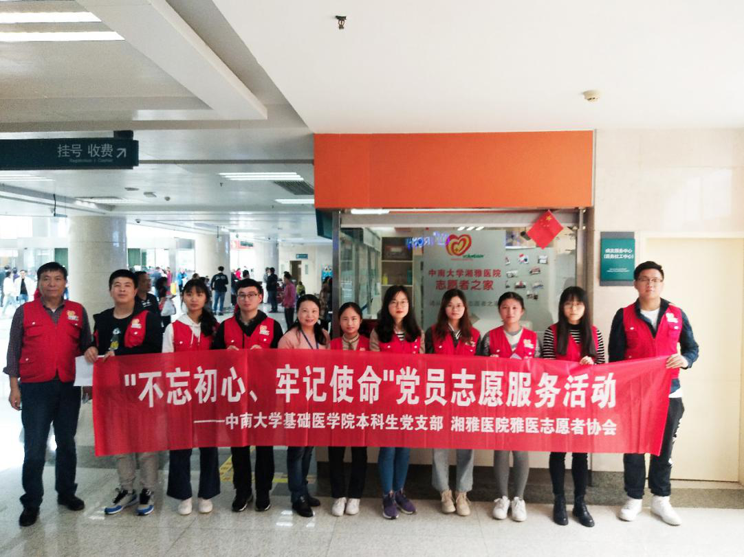 2019年10月24日、25日,基础医学院本科生党支部联合湘雅医院雅医志愿者协会,在黄漫 湘雅医院开展了“不忘初心、牢记使命”党员志愿服务活动,支部共有18名党员分两批次参加了此次活动。